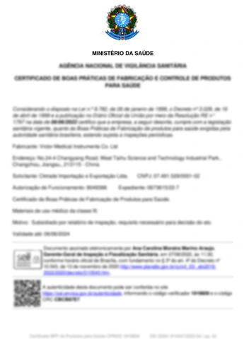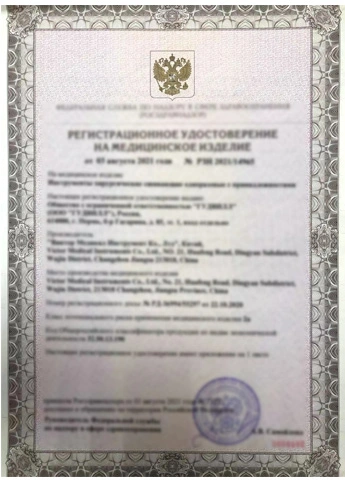 Par se conformer strictement aux exigences opérationnelles d'ISO13485, GMP et CE, leInstruments de chirurgieProduits par Victor Medical ont été successivement certifiés par CFDA, la FDA américaine, le Brésil ANVISA, la FDA coréenne, l'enregistrement de l'Inde, l'enregistrement de l'Iran, l'Arabie saoudite SFDA et les administrations compétentes d'autres pays.